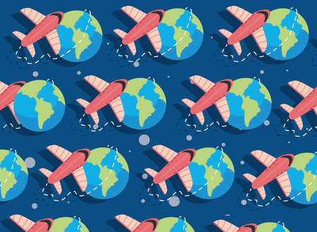 Looking at the earth from the plane. Passenger aircrafts flying around the globe at daylight. Represents travelling around the world.