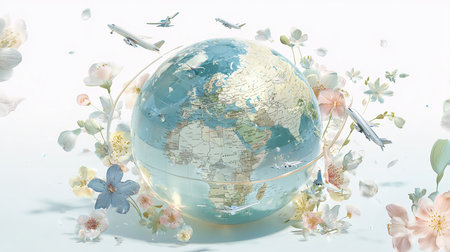 Globe with a flying plane and flowers on a white background.