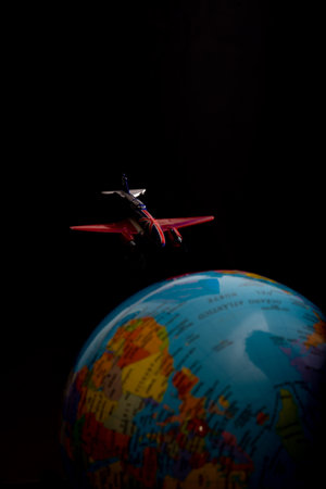 A vertical shot of a toy plane and a globe on a dark background