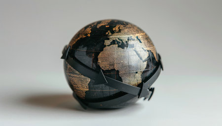 a globe is wrapped in a black strap on a white surface. High quality