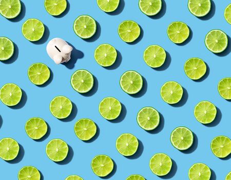 One out unique piggy bank surrounded by limes - flat lay