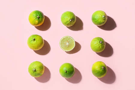 Organic green lime pattern on a pastel pink background. Hipster flat lay concept.