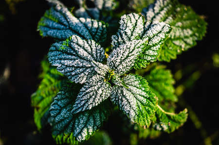 Top-down image of a nettle covered with a thin layer of frost in the sun on a winter's day