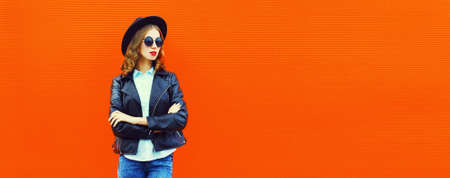 Portrait of stylish woman model posing wearing black rock style leather jacket, round hat on red background