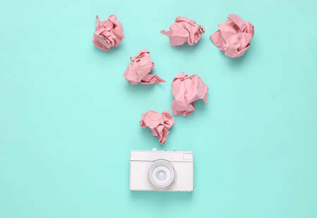 Vintage film photo camera on a colorful blue and yellow background, top view.