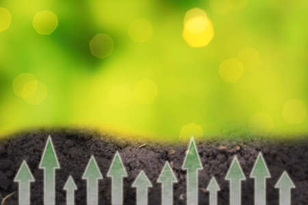 Fertile loam soil suitable for planting with green bokeh. Gardening or planting concept. Arrows show growth and development.