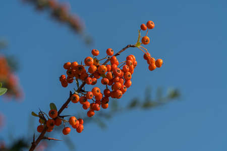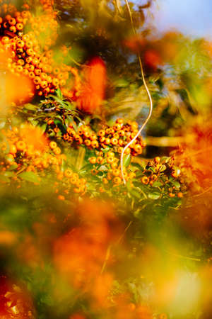 Rowanberries sour but rich vitamin C. Pyracantha plant, also known as firethorn in a garden in a sunny autumn day, beautiful outdoor floral background photographed with soft focus