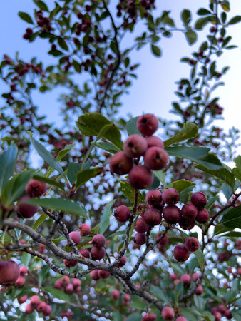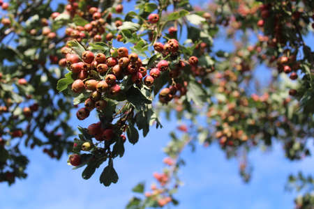 Mature hawthorn fruit hanging from branches in dense leaves. Natural seasonal background of health and natural illustrations. Macro photography of hawthorn fruit in green leaf background.