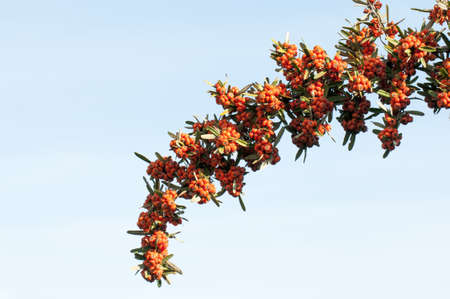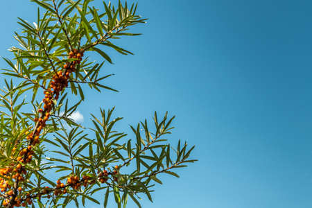 Branch of sea buckthorn with orange berries against background of blue sky. Harvesting autumn harvest in forest. Ingredient for vitamin juice. This oil is used in medicine and cosmetology