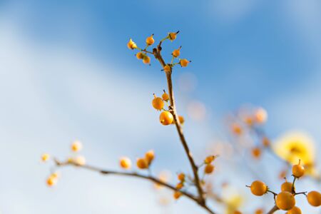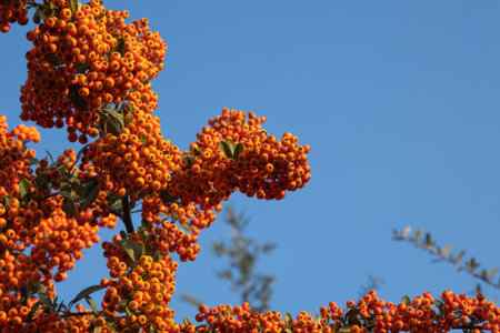 Bright orange berries of evergreen ornamental bush. From beginning of autum until winter, numerous spherical, golden-yellow fruits are held. Hedgerows and most famous wall bushes. Horizontal photo.