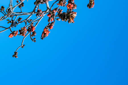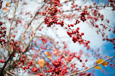 A branch of a wild-growing red berry in late autumn against a blue sky
