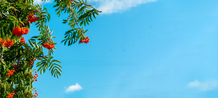 A branches of rowan with red berries background blue sky banner. Autumn and natural background. Autumn banner with rowan berries and leaves. Copy space. High quality photo