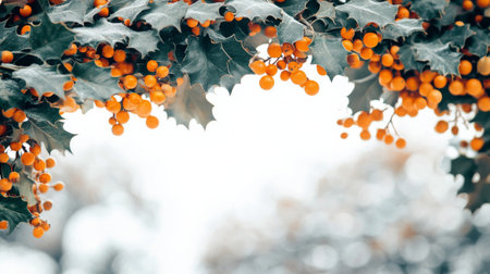 Brilliant clusters of bright orange berries hang amidst lush green leaves on a foggy autumn day. The tranquil atmosphere creates a serene backdrop for this natural display.