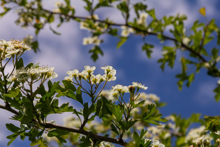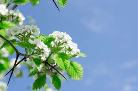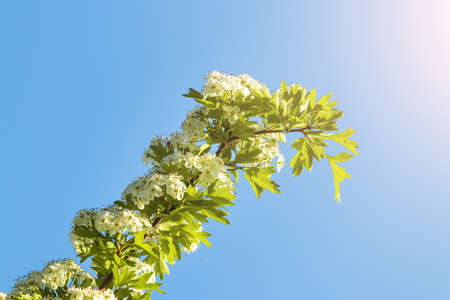 Hawthorn branches with flowers and green leaves on a blue sky background