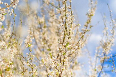 Cherry blossom close-up with white beautiful fresh flowers sunny day, floral natural background
