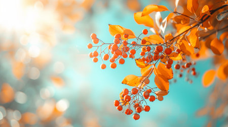 Beautiful panoramic autumn scenery with colorful leaves, berries and bokeh background