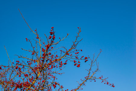 Red hawthorn berries grow on a bush against a blue sky. Red hawthorn berries in nature, autumn seasonal background. Crataegus monogyna