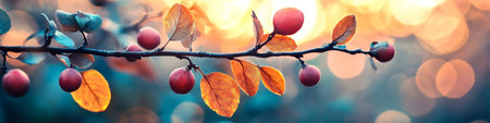 Vibrant Autumn Landscape Featuring Twigs, Crimson Fruits, and Soft-Focus Bokeh for Background Design