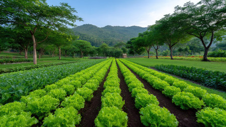 Rows of vibrant green vegetables thrive in rich soil under bright sunlight. Surrounding greenery adds to the serene atmosphere of this flourishing farm.