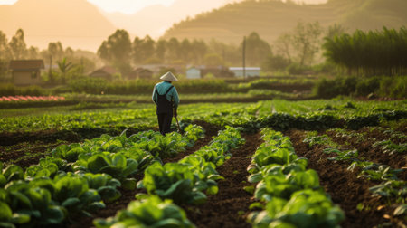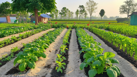 A Lush green organic farm with rows of fresh vegetables under warm sunlight