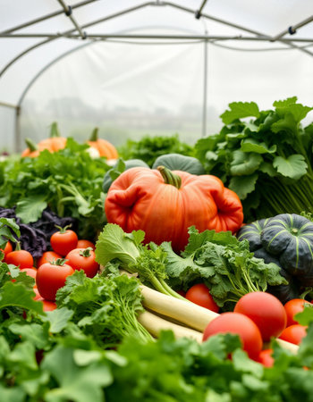 Variety of fresh vegetables in a greenhouse. Selective focus.