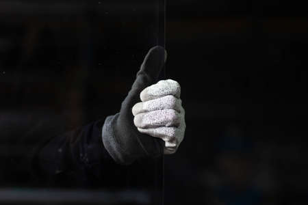 Horror and firearms topic: the killer with a gun in his hand in black gloves on a gray background