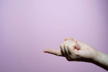 Child's hand shows gesture. Child's fingers. Hand on gray background.