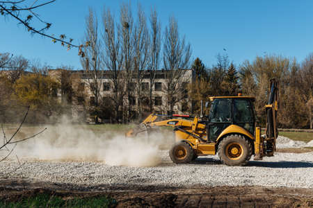 Dneprorudnoe/Ukraine - April 08 2020: A tractor pours the gravel from the bucket