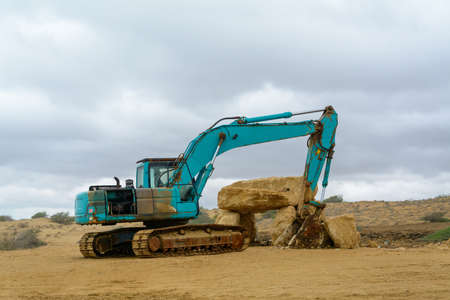 Excavator working in an open-air site, digging up the earth under the wide blue sky