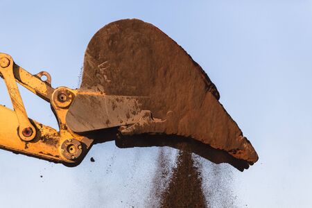 Backdrop of excavator bucket with soil on forest and sky background.2020