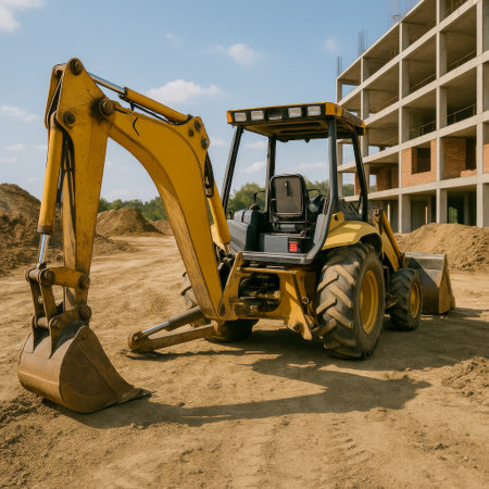 AI-generated image of a yellow backhoe parked on dirt ground at a construction site. The background features a partially built concrete and brick structure, piles of soil, and a clear blue sky.