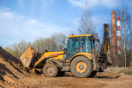 Excavator working on a construction site. Backhoe working on a building site