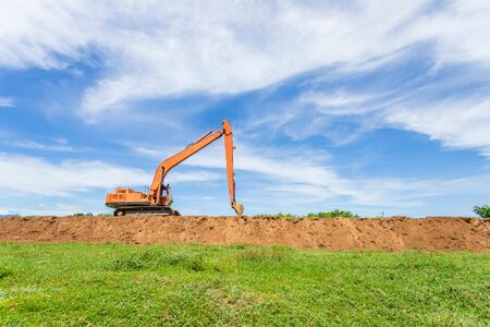 Big orange tracked excavator operate and digging the soil on site. Excavator building the wall of river view in daytime with clear blue sky background
