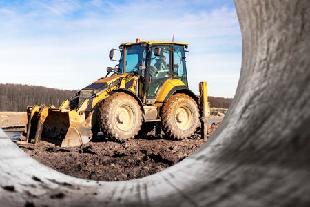 An excavator digging soil framed within a large pipe, dynamic wideangle perspective under clear blue skies