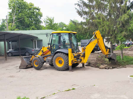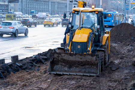 Yellow excavator, bulldozer and working tractor. Road works in the city center.