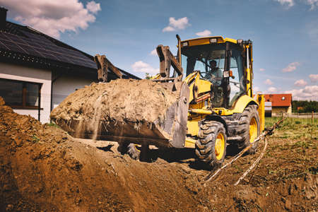Excavator at house construction site - digging foundations for modern house