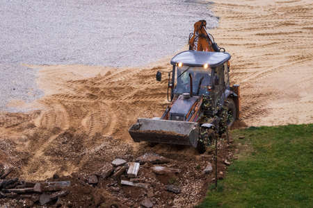 The excavator loader works with a bucket for transporting sand at a construction site. Professional construction equipment for earthworks
