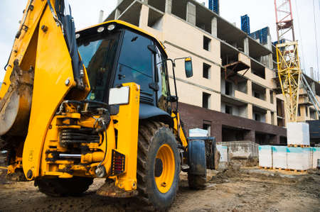 close up details of massive heavy duty machinery, industrial backhoe loader with excavator on construction site
