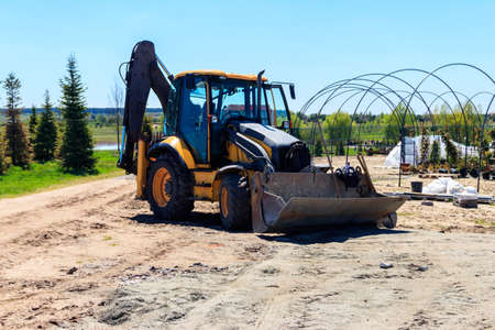 Yellow Excavator. yellow tractor on the field. Construction Machinery On Field. large yellow wheel loader aligns a piece of land for a new building. Tractor On Farmland.