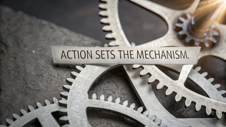 Close-up of interconnected gears with a motivational message showcasing intricate mechanical processes, perfect for illustrating the importance of action.