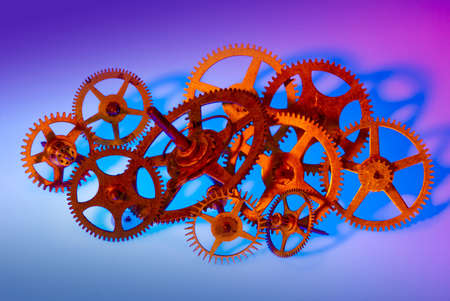 Various sized clock gears bunched together and lit with colored spot lights