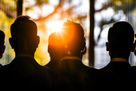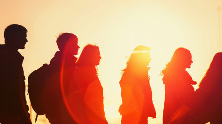 Silhouetted group of people at sunset, social gathering, diverse, outdoors
