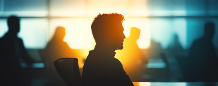 Silhouettes of business people in a conference room meeting, with an abstract background. A business team working together to form a corporate vision concept. High-quality photo. Shot with a Nikon D850 camera, using an f/32 macro lens at an f/4 aperture setting and ISO 6400. Professional color grading, soft shadows, low contrast, clean sharp focus, in the style of magazine photography. --ar 5:2 --v 6.1 Job ID: a6d977ed-8d89-4b66-85ab-545d583bfbf5