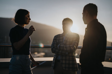 Silhouetted against a glowing sunset, individuals unite in a spirited atmosphere, focusing on teamwork and creativity. The warm light captures their shared moments of inspiration.
