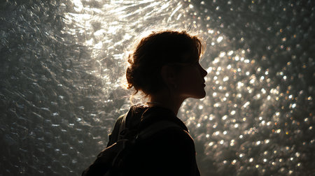 A striking profile of a young woman illuminated by soft sunlight creates a beautiful contrast of light and shadow, showcasing her grace and elegance.