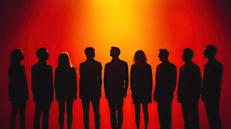 A group of diverse individuals from different backgrounds standing together, their silhouettes cast against a vibrant sunset