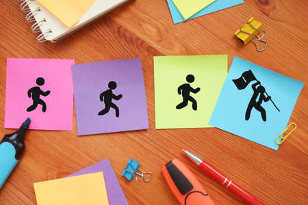 success in people lift concept - step by step to achieve the goals with wood background