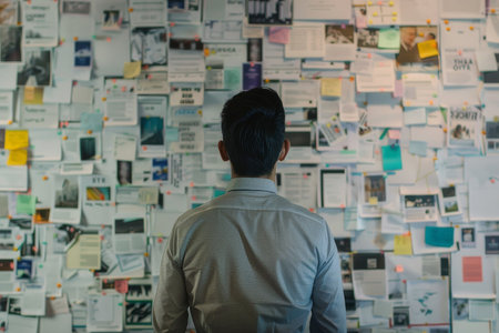 A person observes a vibrant collage filled with text, images, and quotes in a creative environment reflecting inspiration and ideas.