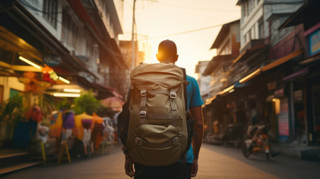 Backpacker walking on a road at sunset, motion blur suggesting movement and travel. Backpacker walking road at sunset journeying towards destination