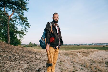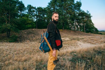 Hipster portrait brutal bearded and moustached woodcutter Gypsy man in the forest with ax. Travel style